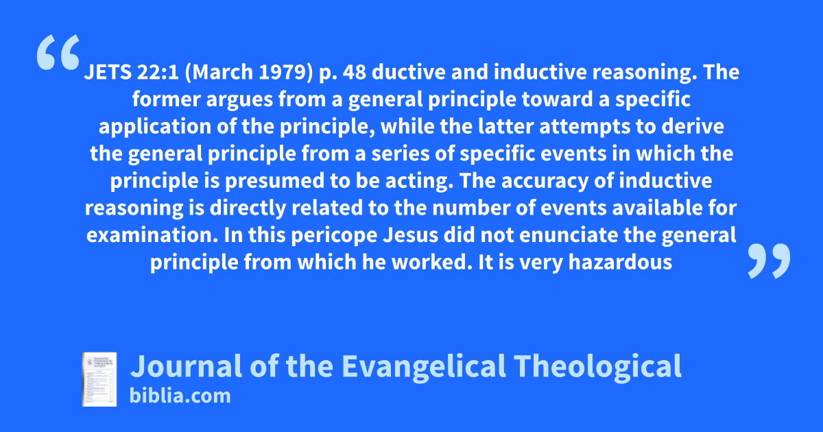JETS 22:1 (March 1979) p. 48 ductive and inductive reasoning. The former argues from a general principle toward a specific application of the principle, while the latter attempts to derive the general principle from a series of specific events in which the principle is presumed to be acting. The accuracy of inductive reasoning is directly related to the number of events available for examination. In this pericope Jesus did not enunciate the general principle from which he worked. It is very hazardous