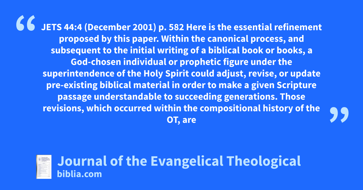 JETS 44:4 (December 2001) p. 582 Here is the essential refinement proposed by this paper. Within the canonical process, and subsequent to the initial writing of a biblical book or books, a God-chosen individual or prophetic figure under the superintendence of the Holy Spirit could adjust, revise, or update pre-existing biblical material in order to make a given Scripture passage understandable to succeeding generations. Those revisions, which occurred within the compositional history of the OT, are
