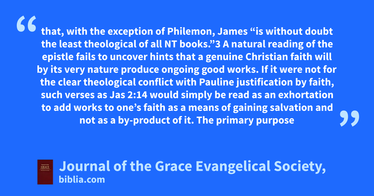 that, with the exception of Philemon, James “is without doubt the least theological of all NT books.”3 A natural reading of the epistle fails to uncover hints that a genuine Christian faith will by its very nature produce ongoing good works. If it were not for the clear theological conflict with Pauline justification by faith, such verses as Jas 2:14 would simply be read as an exhortation to add works to one’s faith as a means of gaining salvation and not as a by-product of it. The primary purpose