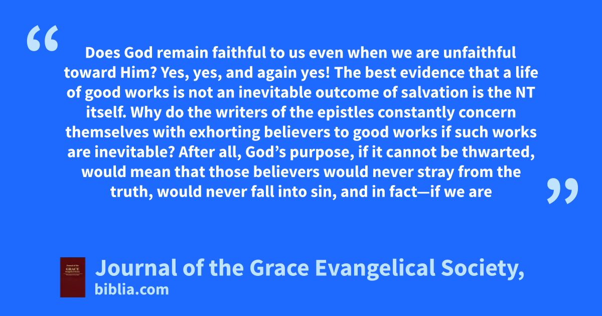 Does God remain faithful to us even when we are unfaithful toward Him? Yes, yes, and again yes! The best evidence that a life of good works is not an inevitable outcome of salvation is the NT itself. Why do the writers of the epistles constantly concern themselves with exhorting believers to good works if such works are inevitable? After all, God’s purpose, if it cannot be thwarted, would mean that those believers would never stray from the truth, would never fall into sin, and in fact—if we are