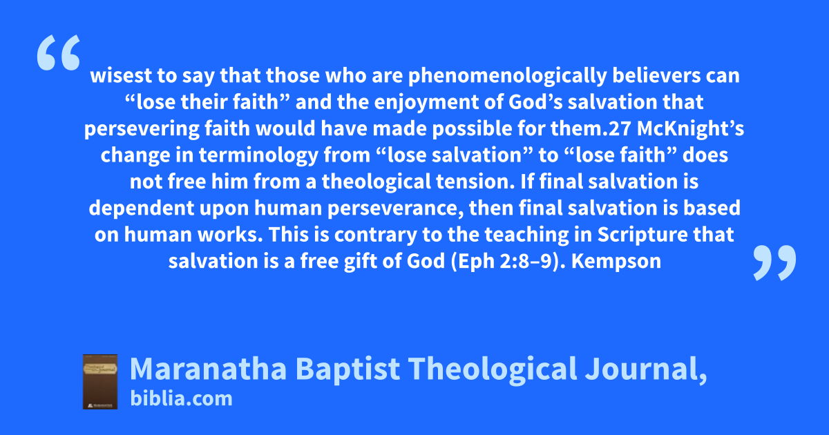 wisest to say that those who are phenomenologically believers can “lose their faith” and the enjoyment of God’s salvation that persevering faith would have made possible for them.27 McKnight’s change in terminology from “lose salvation” to “lose faith” does not free him from a theological tension. If final salvation is dependent upon human perseverance, then final salvation is based on human works. This is contrary to the teaching in Scripture that salvation is a free gift of God (Eph 2:8–9). Kempson