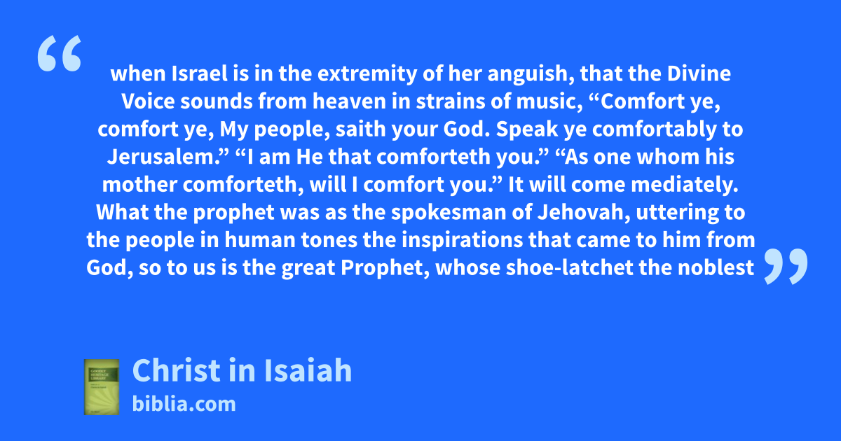when Israel is in the extremity of her anguish, that the Divine Voice sounds from heaven in strains of music, “Comfort ye, comfort ye, My people, saith your God. Speak ye comfortably to Jerusalem.” “I am He that comforteth you.” “As one whom his mother comforteth, will I comfort you.” It will come mediately. What the prophet was as the spokesman of Jehovah, uttering to the people in human tones the inspirations that came to him from God, so to us is the great Prophet, whose shoe-latchet the noblest