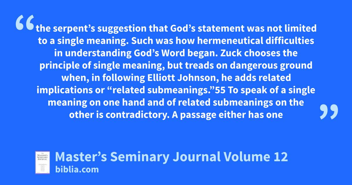 the serpent’s suggestion that God’s statement was not limited to a single meaning. Such was how hermeneutical difficulties in understanding God’s Word began. Zuck chooses the principle of single meaning, but treads on dangerous ground when, in following Elliott Johnson, he adds related implications or “related submeanings.”55 To speak of a single meaning on one hand and of related submeanings on the other is contradictory. A passage either has one