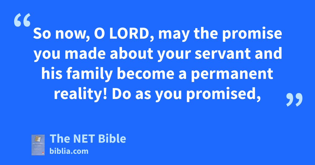 17:16 David went in, sat before the Lord, and said: “Who am I, O Lord God, and what is my family,25 that you should have brought me to this point? 17:17 And you did not stop there, O God! You have also spoken about the future of your servant’s family.26 You have revealed to me what men long to know,27 O Lord God. 17:18 What more can David say28 to you? You have honored your servant; you have given your servant special recognition.29 17:19 O Lord, for the sake of your servant and according to your will,30 you have done this great thing in order to reveal your greatness.31 17:20 O Lord, there is none like you; there is no God besides you! What we heard is true!32 17:21 And who is like your people, Israel, a unique nation33 in the earth? Their God34 went to claim35 a nation for himself! You made a name for yourself by doing great and awesome deeds36 when you drove out37 nations before your people whom you had delivered from the Egyptian empire and its gods.38 17:22 You made Israel your very own nation for all time.39 You, O Lord, became their God. 17:23 So now, O Lord, may the promise you made about your servant and his family become a permanent reality!40 Do as you promised,41 17:24 so42 it may become a reality43 and you may gain lasting fame,44 as people say,45 ‘The Lord who commands armies is the God of Israel.’46 David’s dynasty47 will be established before you, 17:25 for you, my God, have revealed to your servant that you will build a dynasty48 for him. That is why your servant has had the courage to pray to you.49 17:26 Now, O Lord, you are the true God;50 you have made this good promise to your servant.51 17:27 Now you are willing to bless your servant’s dynasty52 so that it may stand permanently before you, for you, O Lord, have blessed it and it will be blessed from now on into the future.”53