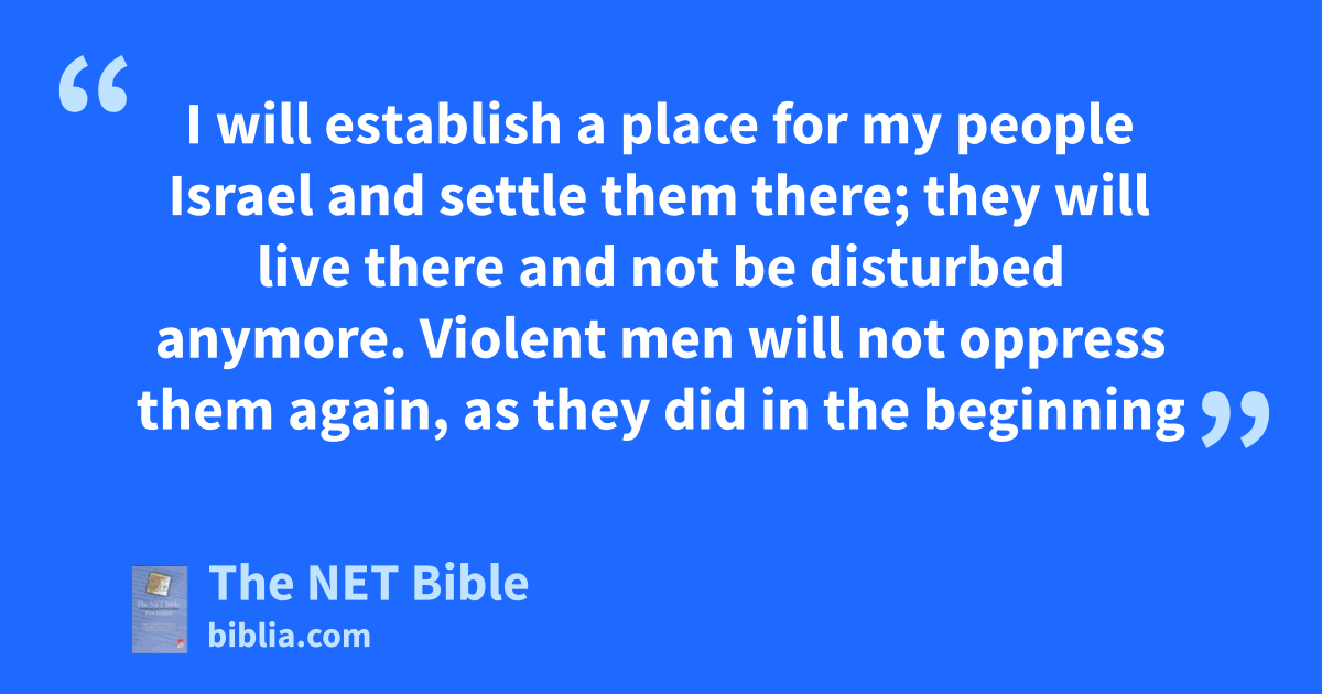 17:7 “So now, say this to my servant David: ‘This is what the Lord who commands armies11 says: “I took you from the pasture and from your work as a shepherd12 to make you a leader of my people Israel. 17:8 I was with you wherever you went and I defeated13 all your enemies before you. Now I will make you as famous as the great men of the earth.14 17:9 I will establish a place for my people Israel and settle15 them there; they will live there and not be disturbed16 anymore. Violent men will not oppress them again, as they did in the beginning17 17:10 and during the time when I appointed judges to lead my people Israel. I will subdue all your enemies.