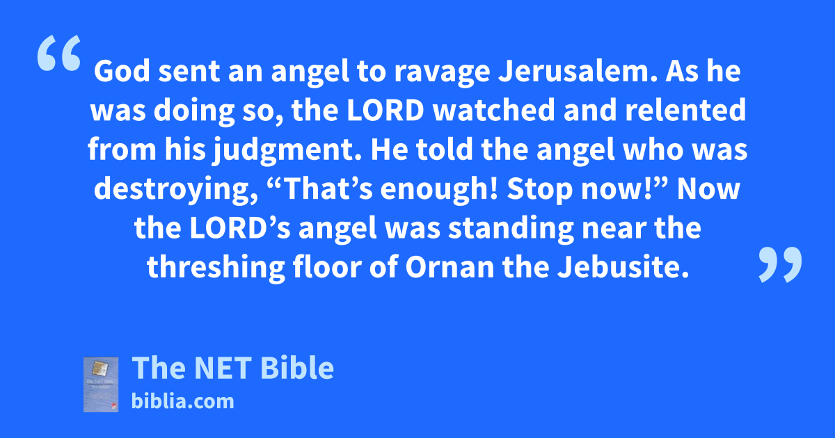 21:15 God sent an angel22 to ravage23 Jerusalem. As he was doing so,24 the Lord watched25 and relented from26 his judgment.27 He told the angel who was destroying, “That’s enough!28 Stop now!”29