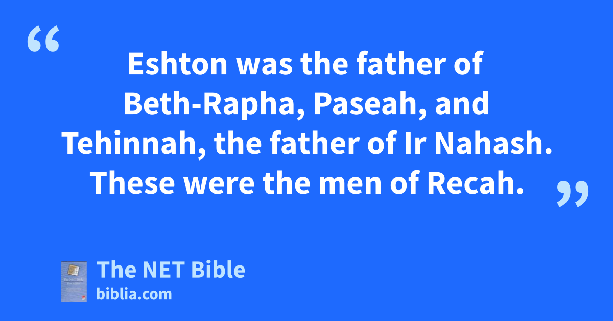 4:11 Kelub, the brother of Shuhah, was the father of Mehir, who was the father of Eshton. 4:12 Eshton was the father of Beth-Rapha, Paseah, and Tehinnah, the father of Ir Nahash.5 These were the men of Recah.