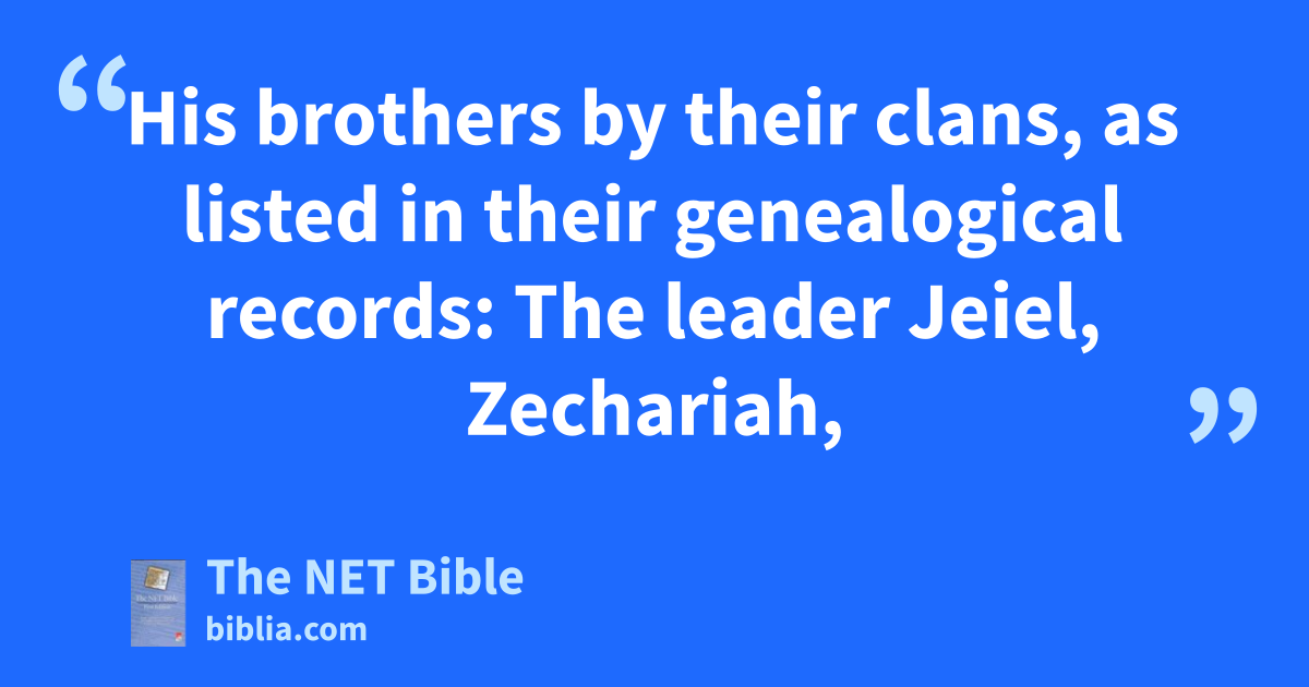 The leader Jeiel, Zechariah, 5:8 and Bela son of Azaz, son of Shema, son of Joel.