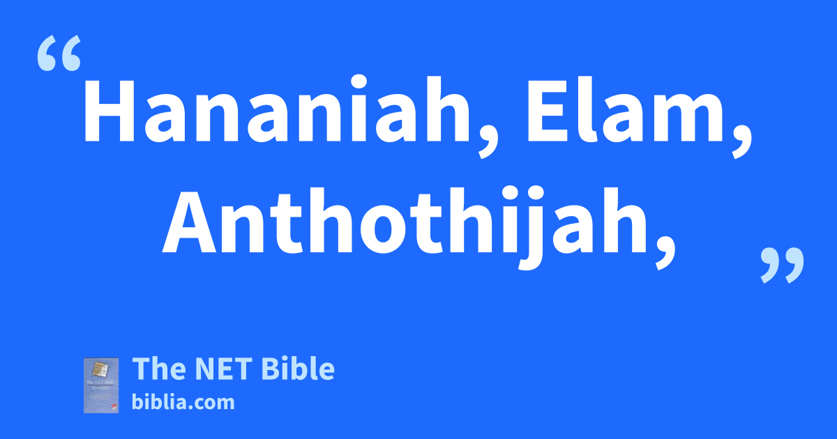 8:22 Ishpan, Eber, Eliel, 8:23 Abdon, Zikri, Hanan, 8:24 Hananiah, Elam, Anthothijah, 8:25 Iphdeiah, and Penuel were the sons of Shashak.