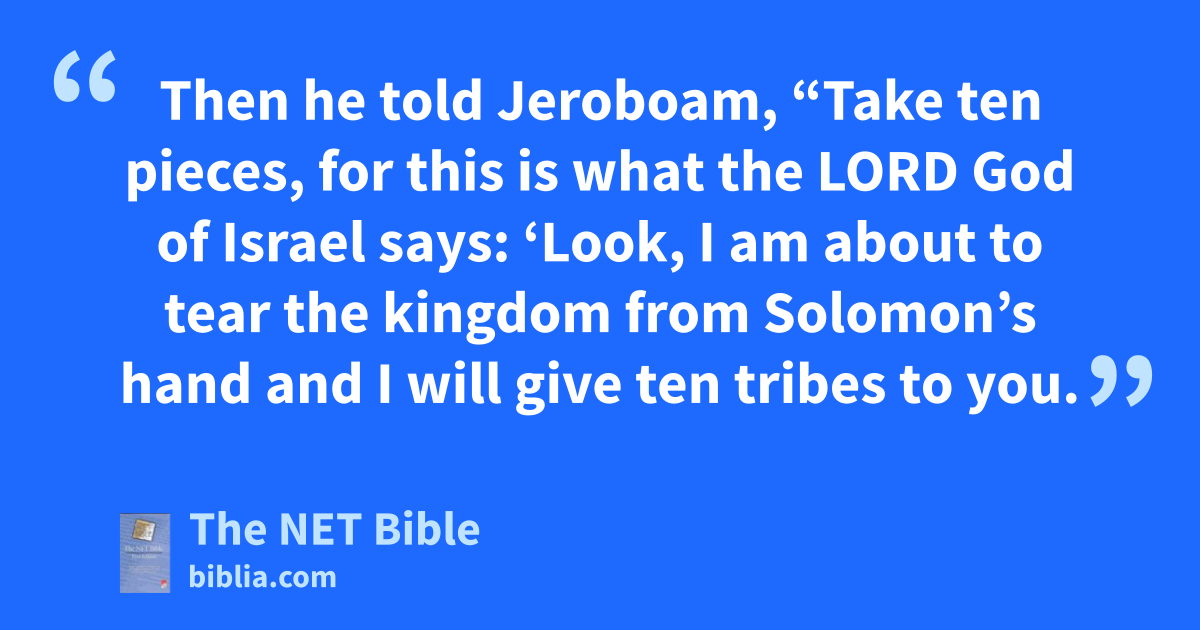 11:26 Jeroboam son of Nebat, one of Solomon’s servants, rebelled against45 the king. He was an Ephraimite46 from Zeredah whose mother was a widow named Zeruah. 11:27 This is what prompted him to rebel against the king:47 Solomon built a terrace and he closed up a gap in the wall of the city of his father David.48 11:28 Jeroboam was a talented man;49 when Solomon saw that the young man was an accomplished worker, he made him the leader of the work crew from the tribe50 of Joseph. 11:29 At that time, when Jeroboam had left Jerusalem, the prophet Ahijah the Shilonite met him on the road; the two of them were alone in the open country. Ahijah51 was wearing a brand new robe, 11:30 and he grabbed the robe52 and tore it into twelve pieces. 11:31 Then he told Jeroboam, “Take ten pieces, for this is what the Lord God of Israel says: ‘Look, I am about to tear the kingdom from Solomon’s hand and I will give ten tribes to you. 11:32 He will retain one tribe, for my servant David’s sake and for the sake of Jerusalem, the city I have chosen out of all the tribes of Israel. 11:33 I am taking the kingdom from him53 because they have54 abandoned me and worshiped the Sidonian goddess Astarte, the Moabite god Chemosh, and the Ammonite god Milcom. They have not followed my instructions55 by doing what I approve and obeying my rules and regulations, like Solomon’s father David did.56 11:34 I will not take the whole kingdom from his hand. I will allow him to be ruler for the rest of his life for the sake of my chosen servant David who kept my commandments and rules. 11:35 I will take the kingdom from the hand of his son and give ten tribes to you.57 11:36 I will leave58 his son one tribe so my servant David’s dynasty may continue to serve me59 in Jerusalem, the city I have chosen as my home.60 11:37 I will select61 you; you will rule over all you desire to have and you will be king over Israel. 11:38 You must obey62 all I command you to do, follow my instructions,63 do what I approve,64 and keep my rules and commandments, like my servant David did. Then I will be with you and establish for you a lasting dynasty, as I did for David;65 I will give you Israel. 11:39 I will humiliate David’s descendants because of this,66 but not forever.”67 11:40 Solomon tried to kill Jeroboam, but Jeroboam escaped to Egypt and found refuge with King Shishak of Egypt.68 He stayed in Egypt until Solomon died.