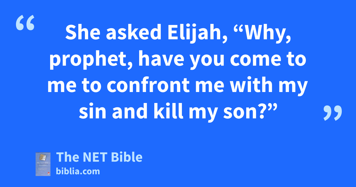 17:17 After this16 the son of the woman who owned the house got sick. His illness was so severe he could no longer breathe. 17:18 She asked Elijah, “Why, prophet, have you come17 to me to confront me with18 my sin and kill my son?” 17:19 He said to her, “Hand me your son.” He took him from her arms, carried him to the upper room where he was staying, and laid him down on his bed. 17:20 Then he called out to the Lord, “O Lord, my God, are you also bringing disaster on this widow I am staying with by killing her son?” 17:21 He stretched out over the boy three times and called out to the Lord, “O Lord, my God, please let this boy’s breath return to him.” 17:22 The Lord answered Elijah’s prayer; the boy’s breath returned to him and he lived. 17:23 Elijah took the boy, brought him down from the upper room to the house, and handed him to his mother. Elijah then said, “See, your son is alive!” 17:24 The woman said to Elijah, “Now I know that you are a prophet and that the Lord really does speak through you.”19