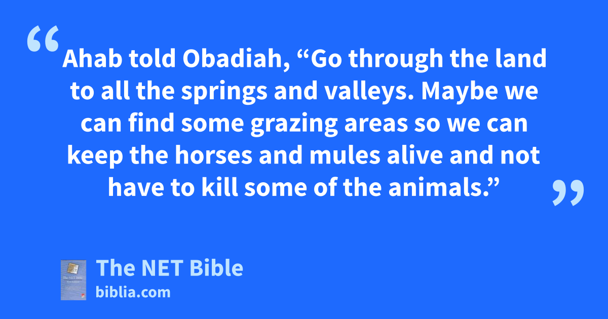 Now the famine was severe in Samaria.2 18:3 So Ahab summoned Obadiah, who supervised the palace. (Now Obadiah was a very loyal follower of the Lord.3 18:4 When Jezebel was killing4 the Lord’s prophets, Obadiah took one hundred prophets and hid them in two caves in two groups of fifty. He also brought them food and water.) 18:5 Ahab told Obadiah, “Go through the land to all the springs and valleys. Maybe we can find some grazing areas5 so we can keep the horses and mules alive and not have to kill6 some of the animals.” 18:6 They divided up the land between them; Ahab went7 one way and Obadiah went the other.
