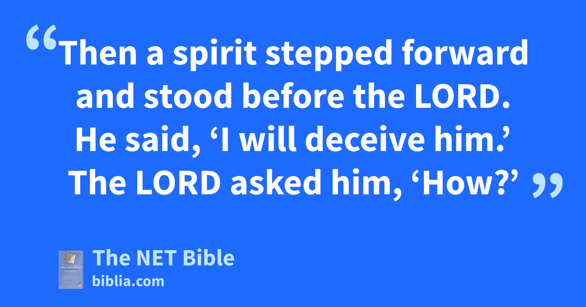 22:15 When he came before the king, the king asked him, “Micaiah, should we attack Ramoth Gilead or not?” He answered him, “Attack! You will succeed; the Lord will hand it over to the king.”16 22:16 The king said to him, “How many times must I make you solemnly promise in17 the name of the Lord to tell me only the truth?” 22:17 Micaiah18 said, “I saw all Israel scattered on the mountains like sheep that have no shepherd. Then the Lord said, ‘They have no master. They should go home in peace.’ ” 22:18 The king of Israel said to Jehoshaphat, “Didn’t I tell you he does not prophesy prosperity for me, but disaster?” 22:19 Micaiah19 said, “That being the case, hear the word of the Lord. I saw the Lord sitting on his throne, with all the heavenly assembly standing on his right and on his left. 22:20 The Lord said, ‘Who will deceive Ahab, so he will attack Ramoth Gilead and die20 there?’ One said this and another that. 22:21 Then a spirit21 stepped forward and stood before the Lord. He said, ‘I will deceive him.’ The Lord asked him, ‘How?’ 22:22 He replied, ‘I will go out and be a lying spirit in the mouths of all his prophets.’ The Lord22 said, ‘Deceive and overpower him.23 Go out and do as you have proposed.’ 22:23 So now, look, the Lord has placed a lying spirit in the mouths of all these prophets of yours; but the Lord has decreed disaster for you.” 22:24 Zedekiah son of Kenaanah approached, hit Micaiah on the jaw, and said, “Which way did the Lord’s spirit go when he went from me to speak to you?” 22:25 Micaiah replied, “Look, you will see in the day when you go into an inner room to hide.” 22:26 Then the king of Israel said, “Take Micaiah and return him to Amon the city official and Joash the king’s son. 22:27 Say, ‘This is what the king says, “Put this man in prison. Give him only a little bread and water24 until I safely return.” ’ ”25 22:28 Micaiah said, “If you really do safely return, then the Lord has not spoken through me.” Then he added, “Take note,26 all you people.”