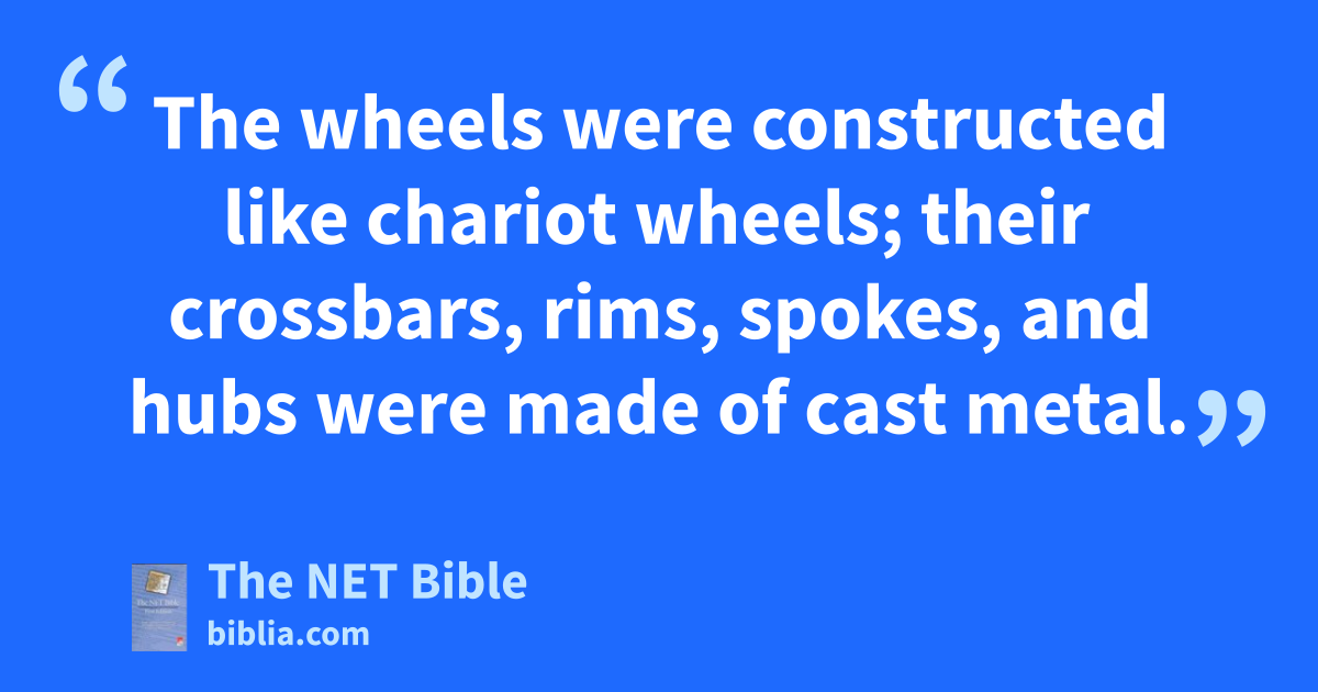 7:27 He also made ten bronze movable stands. Each stand was six feet53 long, six feet54 wide, and four-and-a-half feet55 high. 7:28 The stands were constructed with frames between the joints. 7:29 On these frames and joints were ornamental lions, bulls, and cherubs. Under the lions and bulls were decorative wreaths.56 7:30 Each stand had four bronze wheels with bronze axles and four supports. Under the basin the supports were fashioned on each side with wreaths.57 7:31 Inside the stand was a round opening that was a foot-and-a-half deep; it had a support that was two and one-quarter feet long.58 On the edge of the opening were carvings in square frames.59 7:32 The four wheels were under the frames and the crossbars of the axles were connected to the stand. Each wheel was two and one-quarter feet60 high. 7:33 The wheels were constructed like chariot wheels; their crossbars, rims, spokes, and hubs were made of cast metal. 7:34 Each stand had four supports, one per side projecting out from the stand.61 7:35 On top of each stand was a round opening three-quarters of a foot deep;62 there were also supports and frames on top of the stands. 7:36 He engraved ornamental cherubs, lions, and palm trees on the plates of the supports and frames wherever there was room,63 with wreaths64 all around. 7:37 He made the ten stands in this way. All of them were cast in one mold and were identical in measurements and shape.
