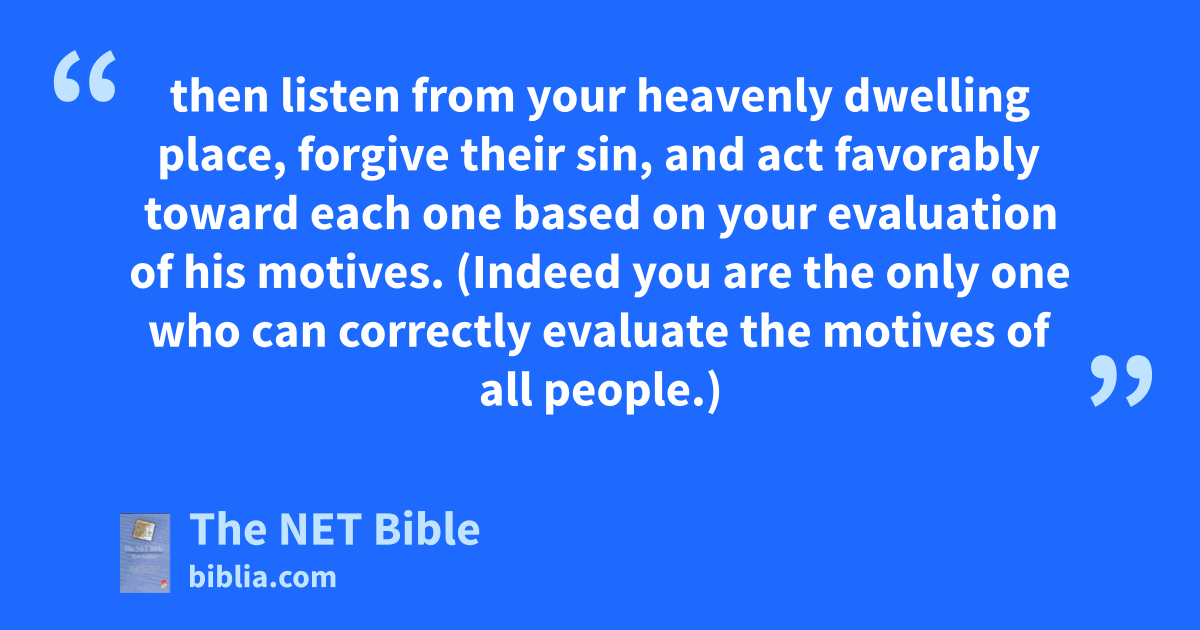 8:37 “The time will come when the land suffers from a famine, a plague, blight and disease, or a locust63 invasion, or when their enemy lays siege to the cities of the land,64 or when some other type of plague or epidemic occurs. 8:38 When all your people Israel pray and ask for help,65 as they acknowledge their pain66 and spread out their hands toward this temple, 8:39 then listen from your heavenly dwelling place, forgive their sin,67 and act favorably toward each one based on your evaluation of his motives.68 (Indeed you are the only one who can correctly evaluate the motives of all people.)69 8:40 Then they will obey70 you throughout their lifetimes as71 they live on the land you gave to our ancestors.