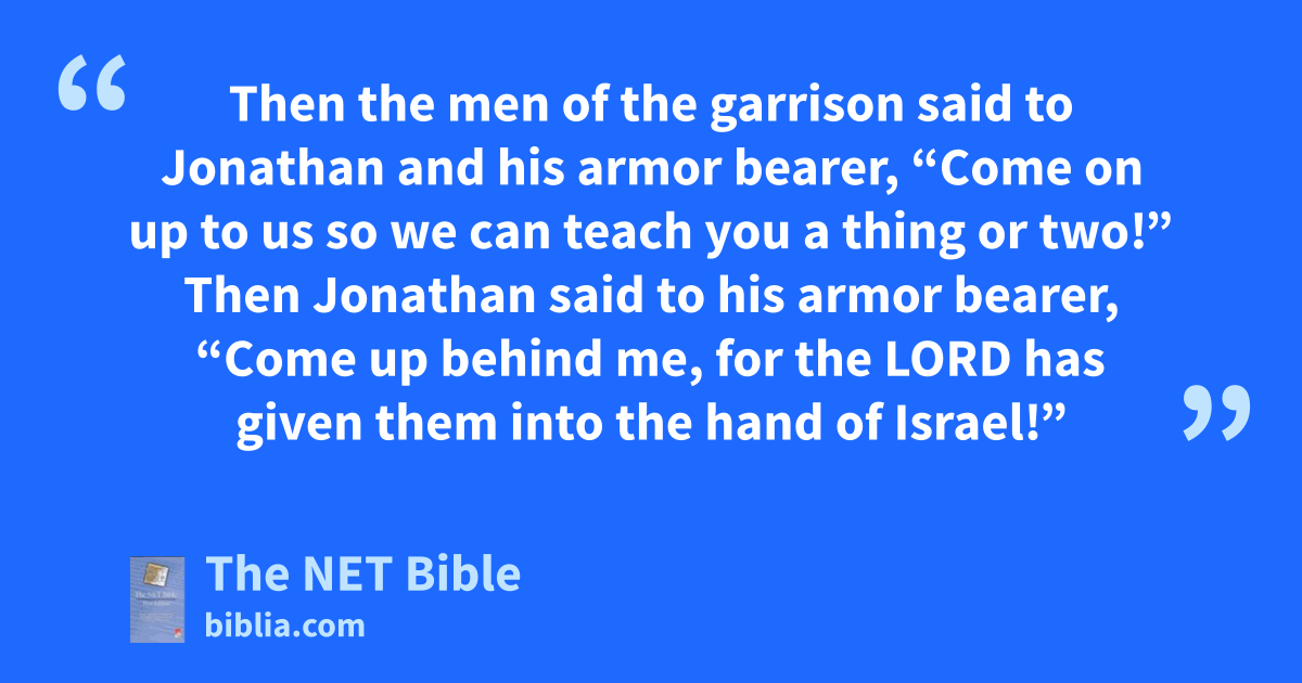 14:11 When they8 made themselves known to the Philistine garrison, the Philistines said, “Look! The Hebrews are coming out of the holes in which they hid themselves.” 14:12 Then the men of the garrison said to Jonathan and his armor bearer, “Come on up to us so we can teach you a thing or two!”9 Then Jonathan said to his armor bearer, “Come up behind me, for the Lord has given10 them into the hand of Israel!”