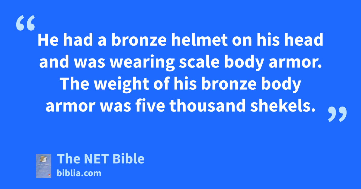 17:4 Then a champion6 came out from the camp of the Philistines. His name was Goliath; he was from Gath. He was close to seven feet tall.7 17:5 He had a bronze helmet on his head and was wearing scale body armor. The weight of his bronze body armor was five thousand shekels.8 17:6 He had bronze shin guards9 on his legs, and a bronze javelin was slung over his shoulders. 17:7 The shaft10 of his spear was like a weaver’s beam, and the iron point of his spear weighed six hundred shekels.11 His shield bearer was walking before him.