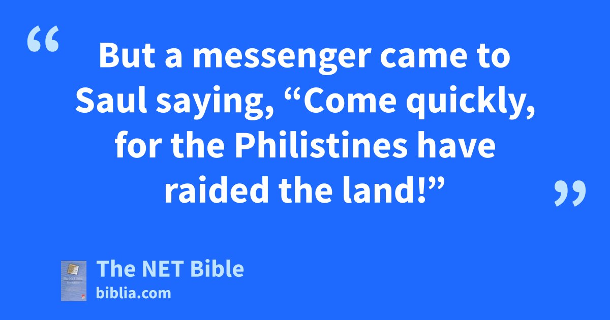 23:24 So they left and went to Ziph ahead of Saul. Now David and his men were in the desert of Maon, in the Arabah to the south of Jeshimon. 23:25 Saul and his men went to look for him.18 But David was informed and went down to the rock and stayed in the desert of Maon. When Saul heard about it, he pursued David in the desert of Maon. 23:26 Saul went on one side of the mountain, while David and his men went on the other side of the mountain. David was hurrying to get away from Saul, but Saul and his men were surrounding David and his men so they could capture them. 23:27 But a messenger came to Saul saying, “Come quickly, for the Philistines have raided the land!”