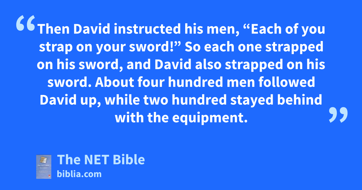 25:12 So David’s servants went on their way. When they had returned, they came and told David13 all these things. 25:13 Then David instructed his men, “Each of you strap on your sword!” So each one strapped on his sword, and David also strapped on his sword. About four hundred men followed David up, while two hundred stayed behind with the equipment.