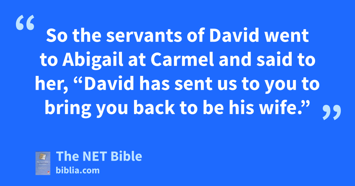 25:40 So the servants of David went to Abigail at Carmel and said to her, “David has sent us to you to bring you back to be his wife.” 25:41 She arose, bowed her face toward the ground, and said, “Your female servant, like a lowly servant, will wash43 the feet of the servants of my lord.” 25:42 Then Abigail quickly went and mounted her donkey, with five of her female servants accompanying her.44 She followed David’s messengers and became his wife.