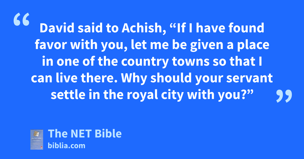 27:5 David said to Achish, “If I have found favor with you, let me be given a place in one of the country towns so that I can live there. Why should your servant settle in the royal city with you?” 27:6 So Achish gave him Ziklag on that day. (For that reason Ziklag has belonged to the kings of Judah until this very day.) 27:7 The length of time3 that David lived in the Philistine countryside was a year4 and four months.