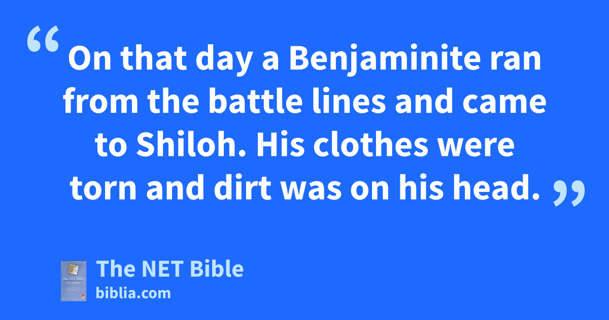 4:12 On that day16 a Benjaminite ran from the battle lines and came to Shiloh. His clothes were torn and dirt was on his head. 4:13 When he arrived in Shiloh, Eli was sitting in his chair watching by the side of17 the road, for he was very worried18 about the ark of God. As the man entered the city to give his report,19 the whole city cried out.