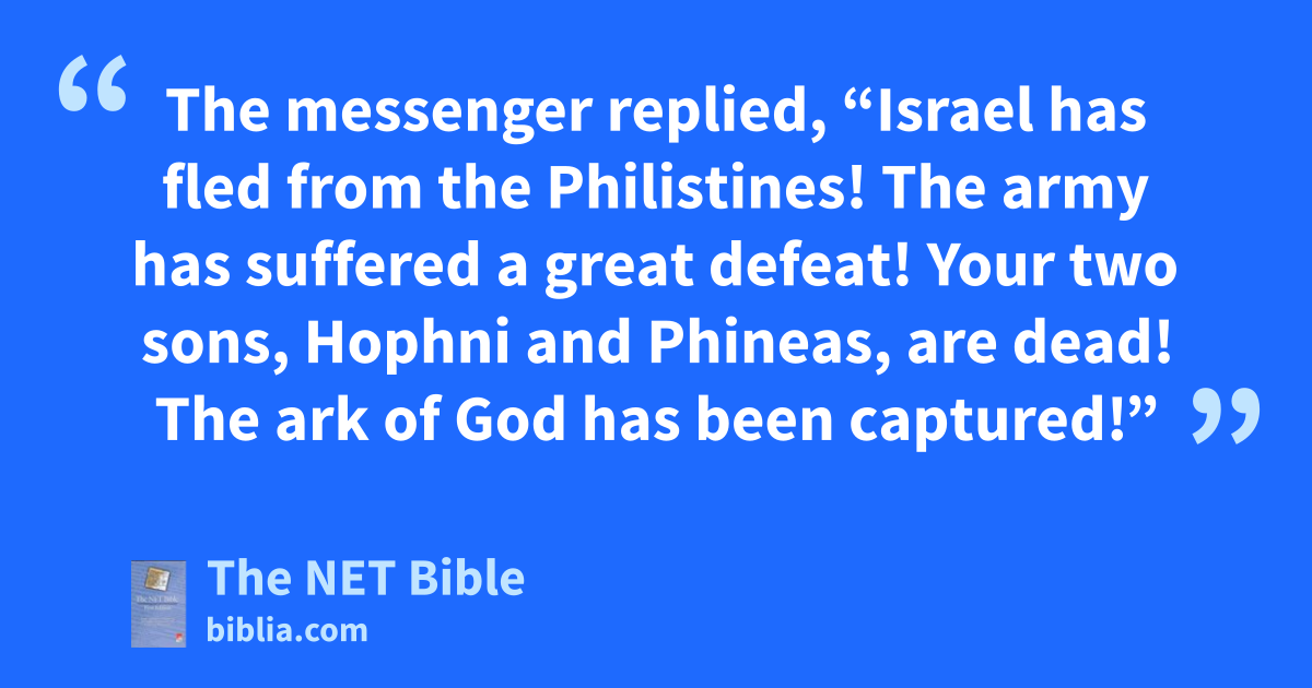 4:16 The man said to Eli, “I am the one who came from the battle lines! Just today I fled from the battle lines!” Eli23 asked, “How did things go, my son?” 4:17 The messenger replied, “Israel has fled from24 the Philistines! The army has suffered a great defeat! Your two sons, Hophni and Phineas, are dead! The ark of God has been captured!”