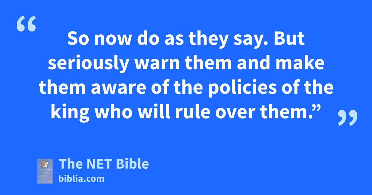 8:6 But this request displeased Samuel, for4 they said, “Give us a king to lead us.” So Samuel prayed to the Lord. 8:7 The Lord said to Samuel, “Do everything the people request of you.5 For it is not you that they have rejected, but it is me that they have rejected as their king. 8:8 Just as they have done6 from the day that I brought them up from Egypt until this very day, they have rejected me and have served other gods. This is what they are also doing to you. 8:9 So now do as they say.7 But seriously warn8 them and make them aware of the policies of the king who will rule over them.”9