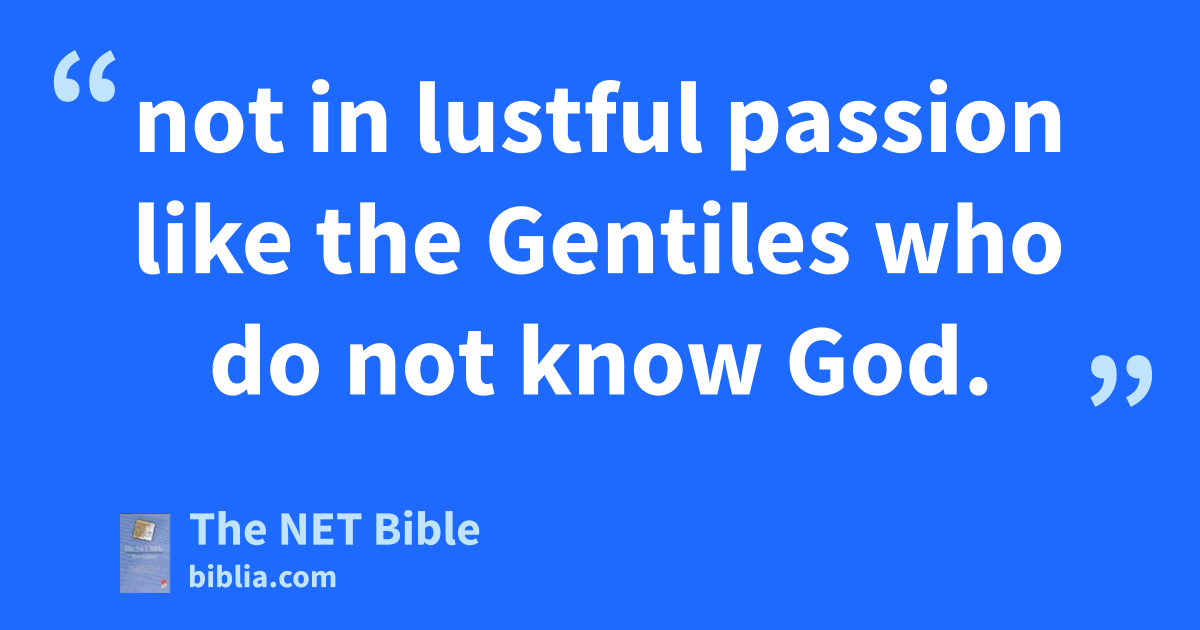 4:1 Finally then, brothers and sisters,1 we ask you and urge you in the Lord Jesus, that as you received instruction from us about how2 you must live and please God (as you are in fact living)3 that you do so more and more. 4:2 For you know what commands we gave you through the Lord Jesus. 4:3 For this is God’s will: that you become holy,4 that you keep away from sexual immorality, 4:4 that each of you know how to possess his own body5 in holiness and honor, 4:5 not in lustful passion like the Gentiles who do not know God. 4:6 In this matter no one should violate the rights of his brother or take advantage of him,6 because the Lord is the avenger in all these cases,7 as we also told you earlier and warned you solemnly. 4:7 For God did not call us to impurity but in holiness. 4:8 Consequently the one who rejects this is not rejecting human authority8 but God, who gives his Holy Spirit to you.