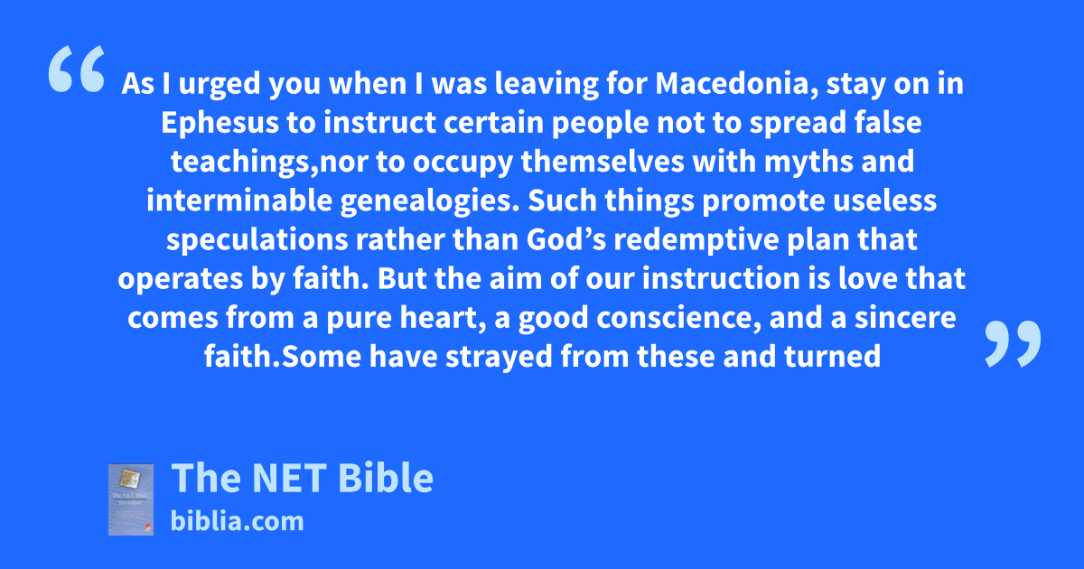 1:3 As I urged you when I was leaving for Macedonia, stay on in Ephesus3 to instruct4 certain people not to spread false teachings,5 1:4 nor to occupy themselves with myths and interminable genealogies.6 Such things promote useless speculations rather than God’s redemptive plan7 that operates by faith. 1:5 But the aim of our instruction8 is love that comes from a pure heart, a good conscience, and a sincere faith.9 1:6 Some have strayed from these and turned away to empty discussion. 1:7 They want to be teachers of the law, but they do not understand what they are saying or the things they insist on so confidently.10