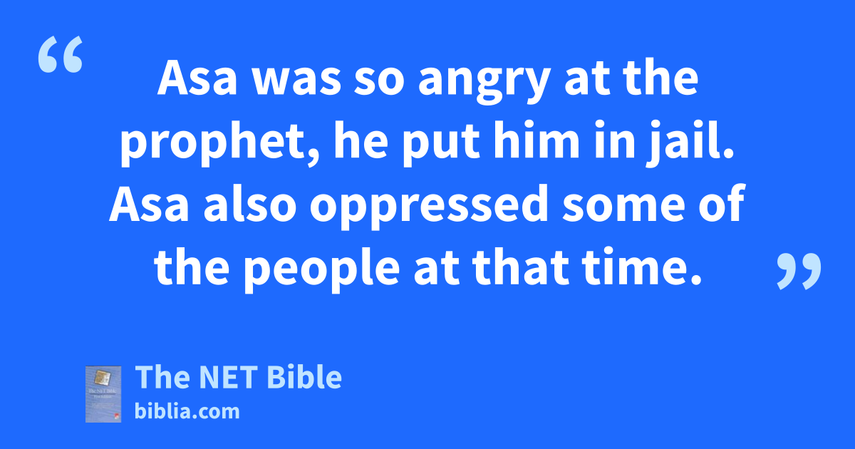 16:7 At that time Hanani the prophet11 visited King Asa of Judah and said to him: “Because you relied on the king of Syria and did not rely on the Lord your God, the army of the king of Syria has escaped from your hand. 16:8 Did not the Cushites and Libyans have a huge army with chariots and a very large number of horsemen? But when you relied on the Lord, he handed them over to you! 16:9 Certainly12 the Lord watches the whole earth carefully13 and is ready to strengthen those who are devoted to him.14 You have acted foolishly in this matter; from now on you will have war. 16:10 Asa was so angry at the prophet, he put him in jail.15 Asa also oppressed some of the people at that time.