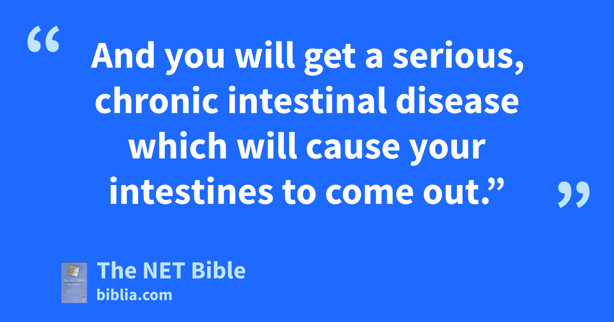 21:12 Jehoram22 received this letter from Elijah the prophet: “This is what the Lord God of your ancestor David says: ‘You23 have not followed in the footsteps24 of your father Jehoshaphat and of25 King Asa of Judah, 21:13 but have instead followed in the footsteps of the kings of Israel. You encouraged the people of Judah and the residents of Jerusalem to be unfaithful to the Lord, just as the family of Ahab does in Israel.26 You also killed your brothers, members of your father’s family,27 who were better than you. 21:14 So look, the Lord is about to severely afflict28 your people, your sons, your wives, and all you own. 21:15 And you will get a serious, chronic intestinal disease which will cause your intestines to come out.”29