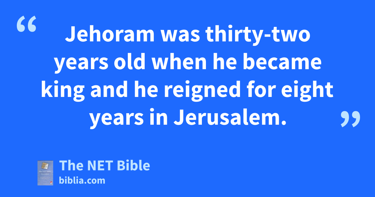 21:4 Jehoram took control of his father’s kingdom and became powerful.6 Then he killed all his brothers,7 as well as some of the officials of Israel. 21:5 Jehoram was thirty-two years old when he became king and he reigned for eight years in Jerusalem.8 21:6 He followed in the footsteps of the kings of Israel, just as Ahab’s dynasty had done, for he married Ahab’s daughter.9 He did evil in the sight of10 the Lord. 21:7 But the Lord was unwilling to destroy David’s dynasty11 because of the promise12 he had made to give David a perpetual dynasty.13
