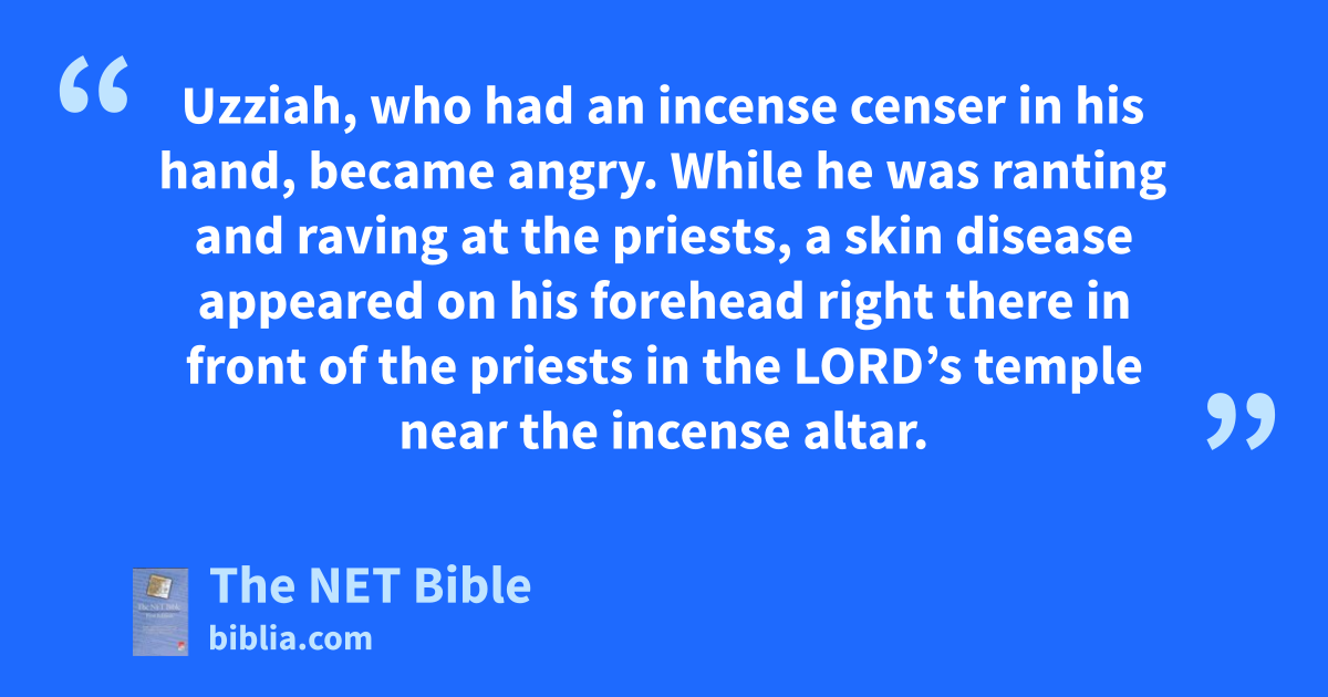 26:16 But once he became powerful, his pride destroyed him.21 He disobeyed22 the Lord his God. He entered the Lord’s temple to offer incense on the incense altar. 26:17 Azariah the priest and eighty other brave priests of the Lord followed him in. 26:18 They confronted23 King Uzziah and said to him, “It is not proper for you, Uzziah, to offer incense to the Lord. That is the responsibility of the priests, the descendants of Aaron, who are consecrated to offer incense. Leave the sanctuary, for you have disobeyed24 and the Lord God will not honor you!” 26:19 Uzziah, who had an incense censer in his hand, became angry. While he was ranting and raving25 at the priests, a skin disease26 appeared on his forehead right there in front of the priests in the Lord’s temple near the incense altar. 26:20 When Azariah the high priest and the other priests looked at27 him, there was a skin disease on his forehead. They hurried him out of there; even the king28 himself wanted to leave quickly because the Lord had afflicted him. 26:21 King Uzziah suffered from a skin disease until the day he died. He lived in separate quarters,29 afflicted by a skin disease and banned from the Lord’s temple. His son Jotham was in charge of the palace and ruled over the people of the land.