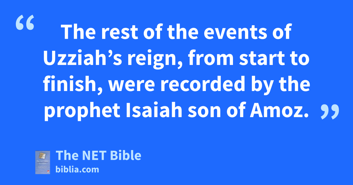 26:22 The rest of the events of Uzziah’s reign, from start to finish, were recorded by the prophet Isaiah son of Amoz.30 26:23 Uzziah passed away31 and was buried near his ancestors32 in a cemetery33 belonging to the kings. (This was because he had a skin disease.)34 His son Jotham replaced him as king.