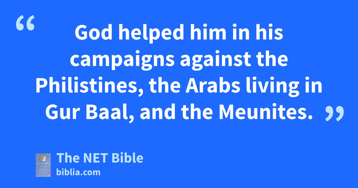 26:6 Uzziah attacked11 the Philistines and broke down the walls of Gath, Jabneh, and Ashdod. He built cities in the region of Ashdod and throughout Philistine territory.12 26:7 God helped him in his campaigns13 against the Philistines, the Arabs living in Gur Baal, and the Meunites. 26:8 The Ammonites paid tribute to Uzziah and his fame reached14 the border of Egypt, for he grew in power.