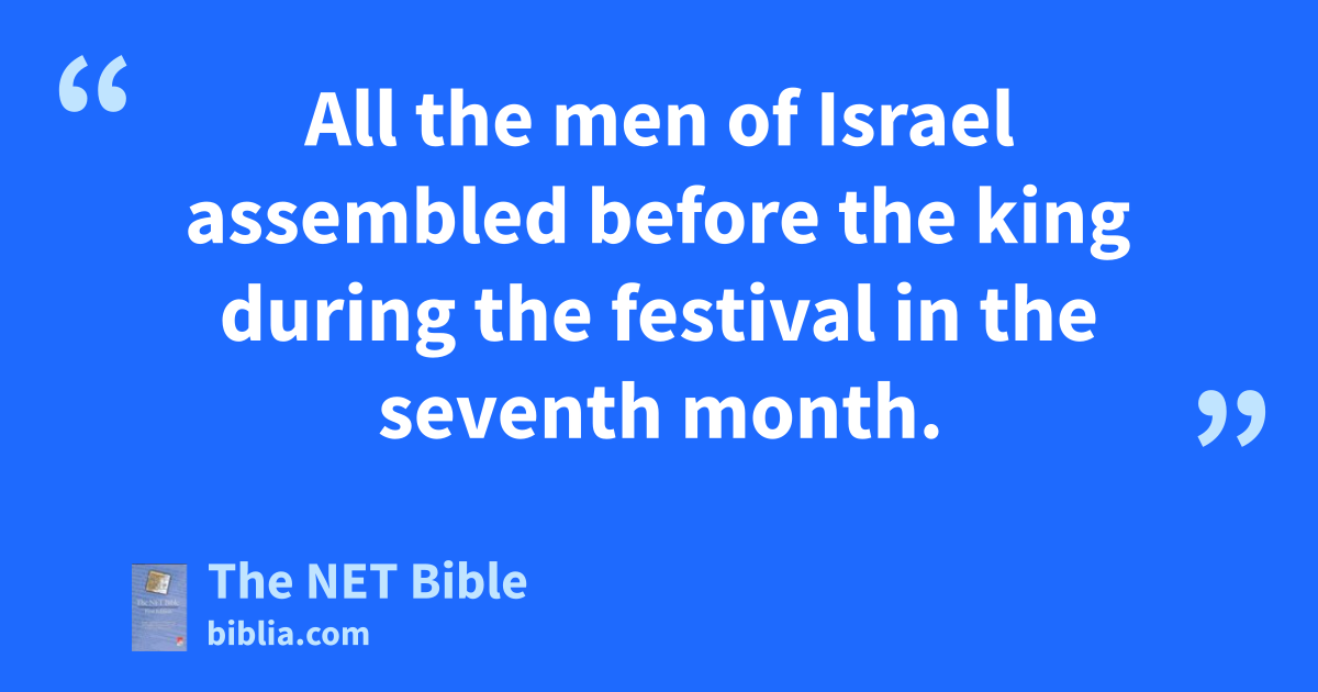 5:2 Then Solomon convened Israel’s elders—all the leaders of the Israelite tribes and families—in Jerusalem,1 so they could witness the transferal of the ark of the covenant of the Lord from the City of David2 (that is, Zion).3 5:3 All the men of Israel assembled before the king during the festival4 in the seventh month.5 5:4 When all Israel’s elders had arrived, the Levites lifted the ark. 5:5 The priests and Levites carried the ark, the tent where God appeared to his people,6 and all the holy items in the tent.7 5:6 Now King Solomon and all the Israelites who had assembled with him went on ahead of the ark and sacrificed more sheep and cattle than could be counted or numbered.8