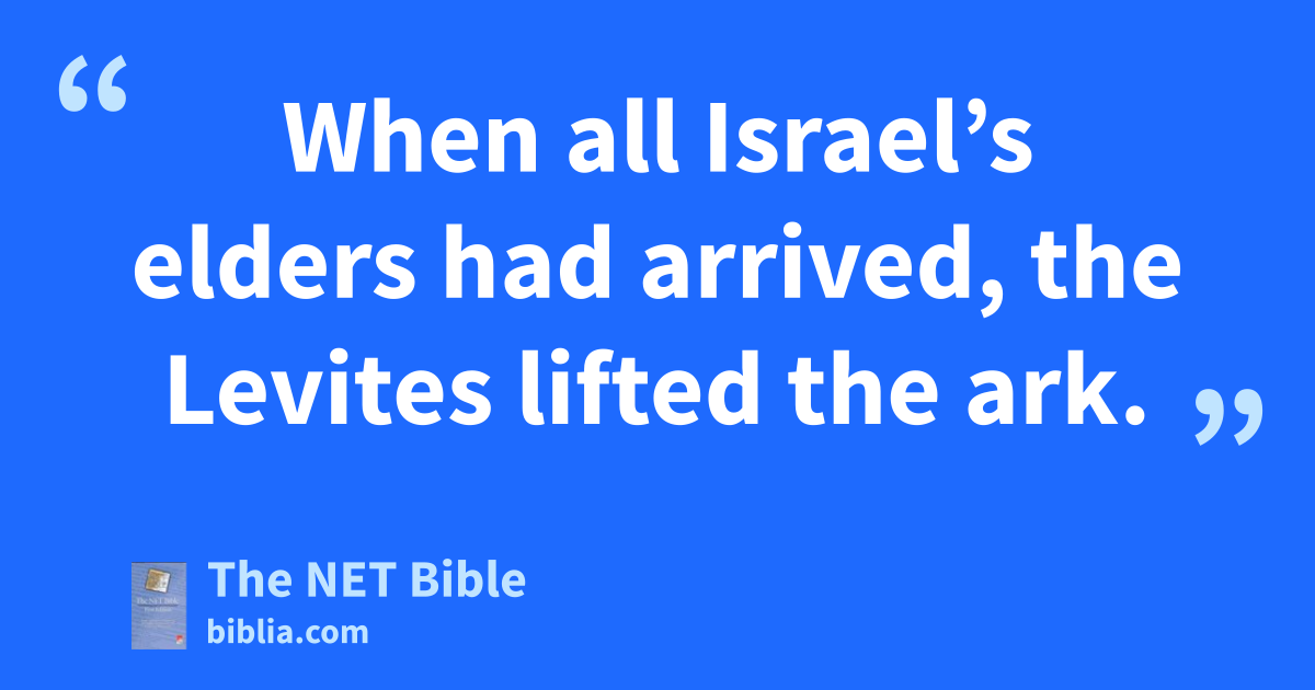 5:2 Then Solomon convened Israel’s elders—all the leaders of the Israelite tribes and families—in Jerusalem,1 so they could witness the transferal of the ark of the covenant of the Lord from the City of David2 (that is, Zion).3 5:3 All the men of Israel assembled before the king during the festival4 in the seventh month.5 5:4 When all Israel’s elders had arrived, the Levites lifted the ark. 5:5 The priests and Levites carried the ark, the tent where God appeared to his people,6 and all the holy items in the tent.7 5:6 Now King Solomon and all the Israelites who had assembled with him went on ahead of the ark and sacrificed more sheep and cattle than could be counted or numbered.8
