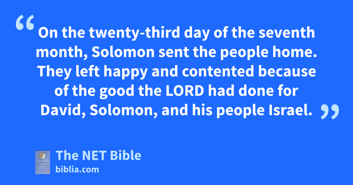 7:4 The king and all the people were presenting sacrifices to the Lord. 7:5 King Solomon sacrificed 22,000 cattle and 120,000 sheep. Then the king and all the people dedicated God’s temple. 7:6 The priests stood in their assigned spots, along with the Levites who had the musical instruments used for praising the Lord.3 (These were the ones King David made for giving thanks to the Lord and which were used by David when he offered praise, saying, “Certainly his loyal love endures.”)4 Opposite the Levites,5 the priests were blowing the trumpets, while all Israel stood there. 7:7 Solomon consecrated the middle of the courtyard that is in front of the Lord’s temple. He offered burnt sacrifices, grain offerings,6 and the fat from the peace offerings there, because the bronze altar that Solomon had made was too small to hold all these offerings.7 7:8 At that time Solomon and all Israel with him celebrated a festival for seven days. This great assembly included people from Lebo Hamath in the north to the Brook of Egypt in the south.8 7:9 On the eighth day they held an assembly, for they had dedicated the altar for seven days and celebrated the festival for seven more days. 7:10 On the twenty-third day of the seventh month, Solomon9 sent the people home. They left10 happy and contented11 because of the good the Lord had done for David, Solomon, and his people Israel.