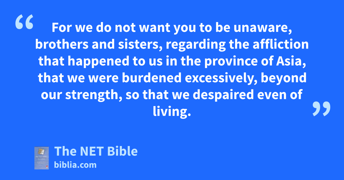 1:3 Blessed is5 the God and Father of our Lord Jesus Christ, the Father of mercies and God of all comfort, 1:4 who comforts us in all our troubles6 so that we may be able to comfort those experiencing any trouble7 with the comfort with which we ourselves are comforted by God. 1:5 For just as the sufferings8 of Christ9 overflow10 toward us, so also our comfort through Christ overflows to you.11 1:6 But if we are afflicted,12 it is for your comfort and salvation; if we are comforted, it is for your comfort that you experience in your patient endurance of the same sufferings that we also suffer. 1:7 And our hope for you is steadfast because we know that as you share in13 our sufferings, so also you will share in14 our comfort. 1:8 For we do not want you to be unaware, brothers and sisters,15 regarding the affliction that happened to us in the province of Asia,16 that we were burdened excessively, beyond our strength, so that we despaired even of living. 1:9 Indeed we felt as if the sentence of death had been passed against us,17 so that we would not trust in ourselves18 but in God who raises the dead. 1:10 He19 delivered us from so great a risk of death, and he will deliver us. We have set our hope on him20 that21 he will deliver us yet again, 1:11 as you also join in helping us by prayer, so that many people may give thanks to God22 on our behalf for the gracious gift given to us through the help of many.