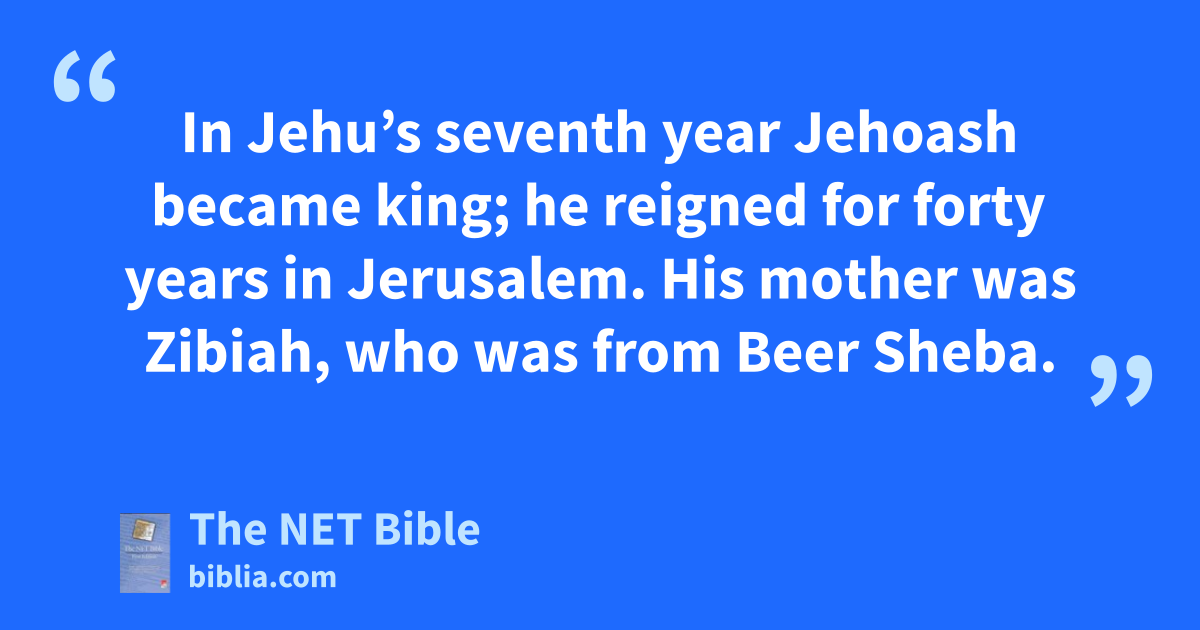 11:21 (12:1)38 Jehoash39 was seven years old when he began to reign. 12:1 (12:2) In Jehu’s seventh year Jehoash became king; he reigned for forty years in Jerusalem.1 His mother was Zibiah, who was from Beer Sheba. 12:2 Throughout his lifetime Jehoash did what the Lord approved,2 just as3 Jehoiada the priest taught him. 12:3 But the high places were not eliminated; the people continued to offer sacrifices and burn incense on the high places.