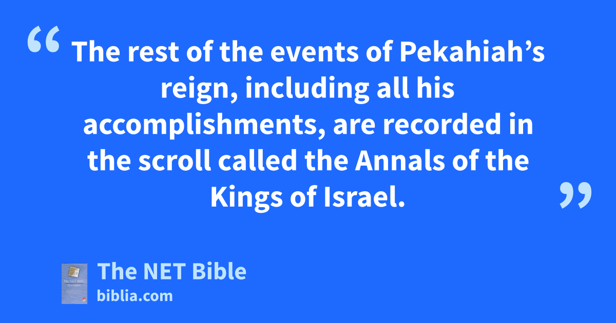 15:26 The rest of the events of Pekahiah’s reign, including all his accomplishments, are recorded in the scroll called the Annals of the Kings of Israel.39