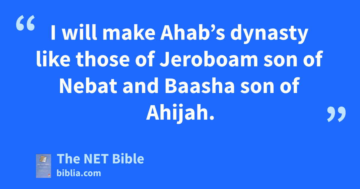 9:4 So the young prophet6 went to Ramoth Gilead. 9:5 When he arrived, the officers of the army were sitting there.7 So he said, “I have a message for you, O officer.”8 Jehu asked, “For which one of us?”9 He replied, “For you, O officer.” 9:6 So Jehu10 got up and went inside. Then the prophet11 poured the olive oil on his head and said to him, “This is what the Lord God of Israel says, ‘I have designated you as king over the Lord’s people Israel. 9:7 You will destroy the family of your master Ahab.12 I will get revenge against Jezebel for the shed blood of my servants the prophets and for the shed blood of all the Lord’s servants.13 9:8 Ahab’s entire family will die. I14 will cut off every last male belonging to Ahab in Israel, including even the weak and incapacitated.15 9:9 I will make Ahab’s dynasty16 like those of Jeroboam son of Nebat and Baasha son of Ahijah. 9:10 Dogs will devour Jezebel on the plot of ground in Jezreel; she will not be buried.’ ”17 Then he opened the door and ran away.
