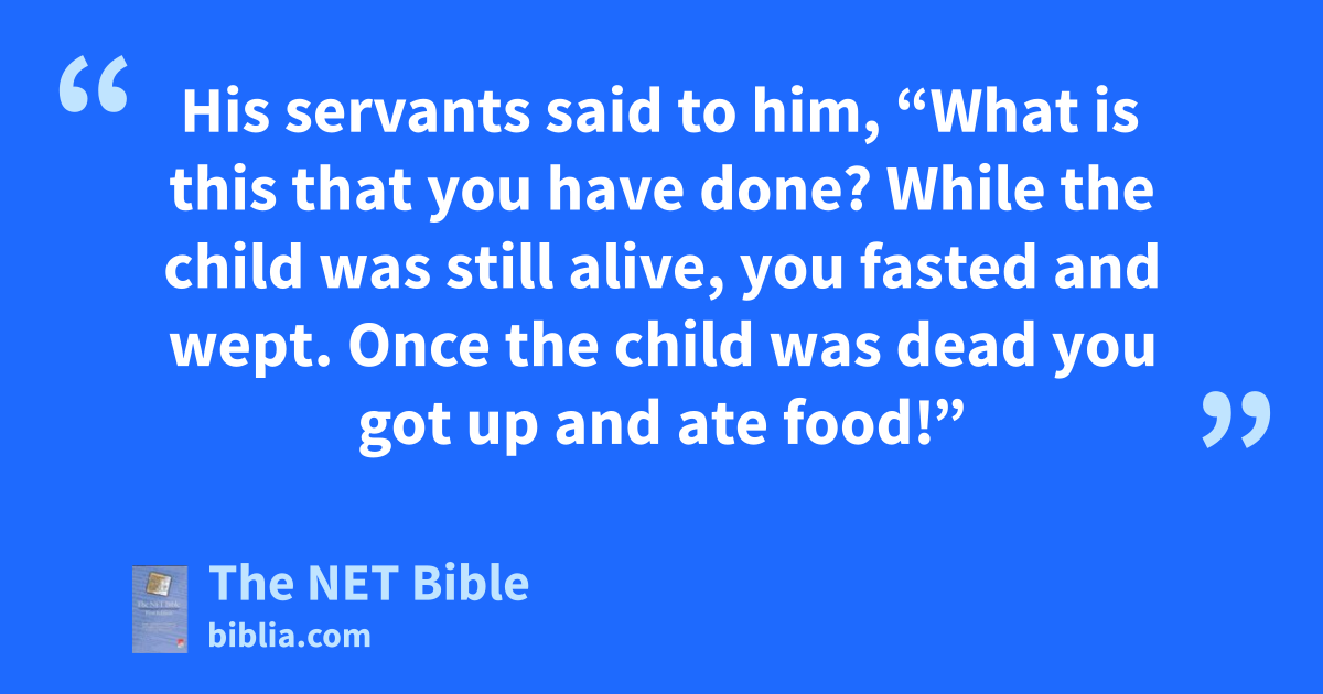 12:19 When David saw that his servants were whispering to one another, he33 realized that the child was dead. So David asked his servants, “Is the child dead?” They replied, “Yes, he’s dead.” 12:20 So David got up from the ground, bathed, put on oil, and changed his clothes. He went to the house of the Lord and worshiped. Then, when he entered his palace, he requested that food be brought to him, and he ate.