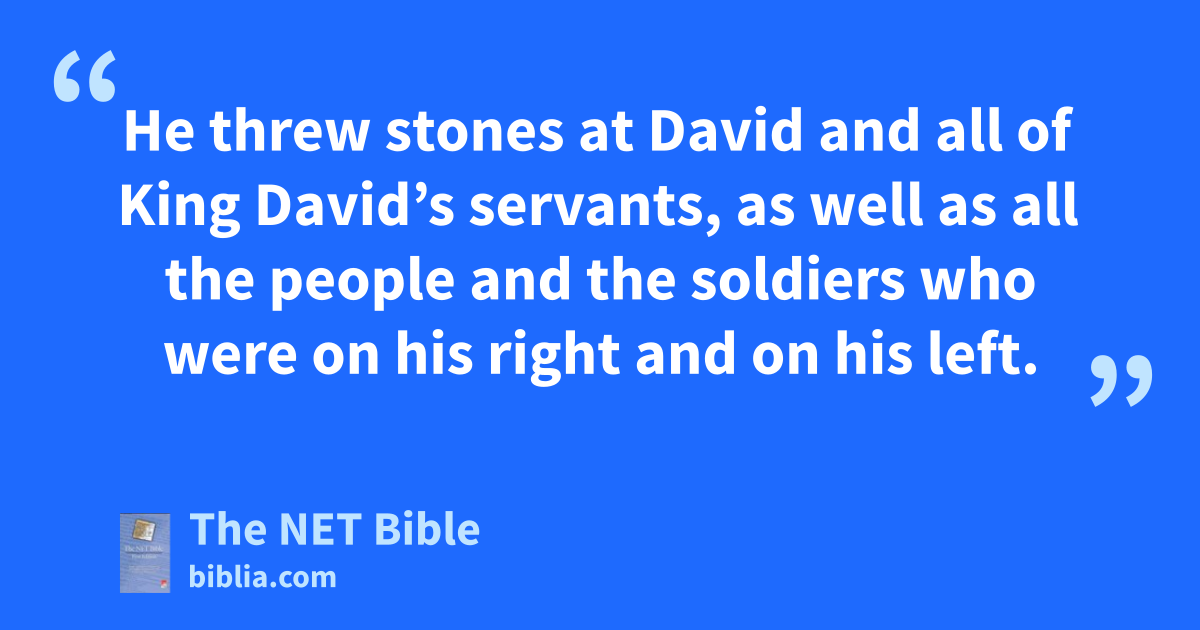 16:5 Then King David reached8 Bahurim. There a man from Saul’s extended family named Shimei son of Gera came out, yelling curses as he approached.9 16:6 He threw stones at David and all of King David’s servants, as well as all the people and the soldiers who were on his right and on his left. 16:7 As he yelled curses, Shimei said, “Leave! Leave! You man of bloodshed, you wicked man!10 16:8 The Lord has punished you for11 all the spilled blood of the house of Saul, in whose place you rule. Now the Lord has given the kingdom into the hand of your son Absalom. Disaster has overtaken you, for you are a man of bloodshed!”