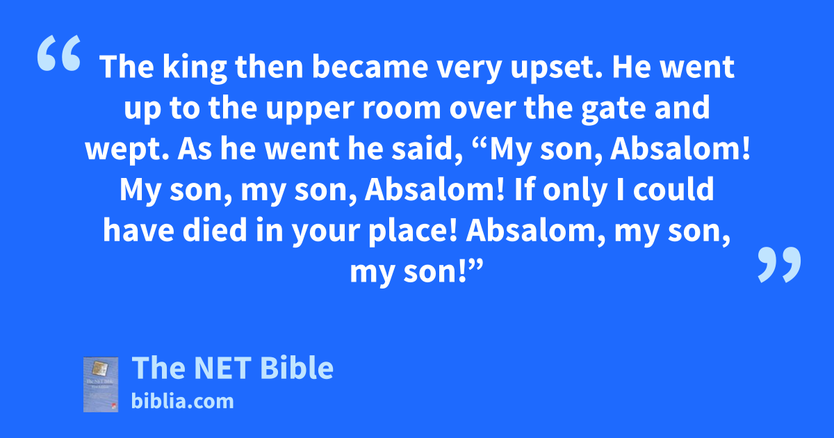 18:33 (19:1)40 The king then became very upset. He went up to the upper room over the gate and wept. As he went he said, “My son, Absalom! My son, my son,41 Absalom! If only I could have died in your place! Absalom, my son, my son!”42