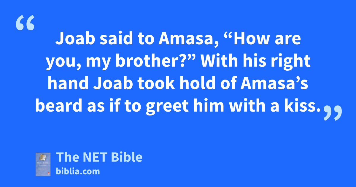 20:9 Joab said to Amasa, “How are you, my brother?” With his right hand Joab took hold of Amasa’s beard as if to greet him with a kiss. 20:10 Amasa did not protect himself from the knife in Joab’s other hand, and Joab14 stabbed him in the abdomen, causing Amasa’s15 intestines to spill out on the ground. There was no need to stab him again; the first blow was fatal.16 Then Joab and his brother Abishai pursued Sheba son of Bicri.