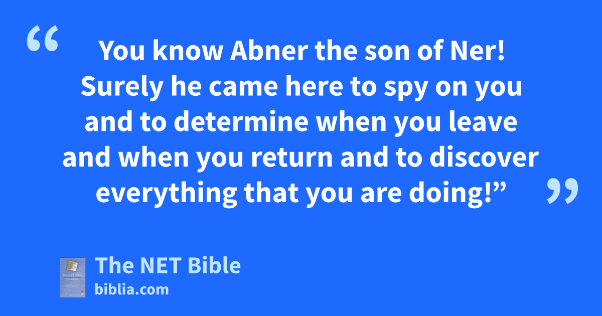 3:24 So Joab went to the king and said, “What have you done? Abner33 has come to you! Why would you send him away? Now he’s gone on his way!34 3:25 You know Abner the son of Ner! Surely he came here to spy on you and to determine when you leave and when you return35 and to discover everything that you are doing!”