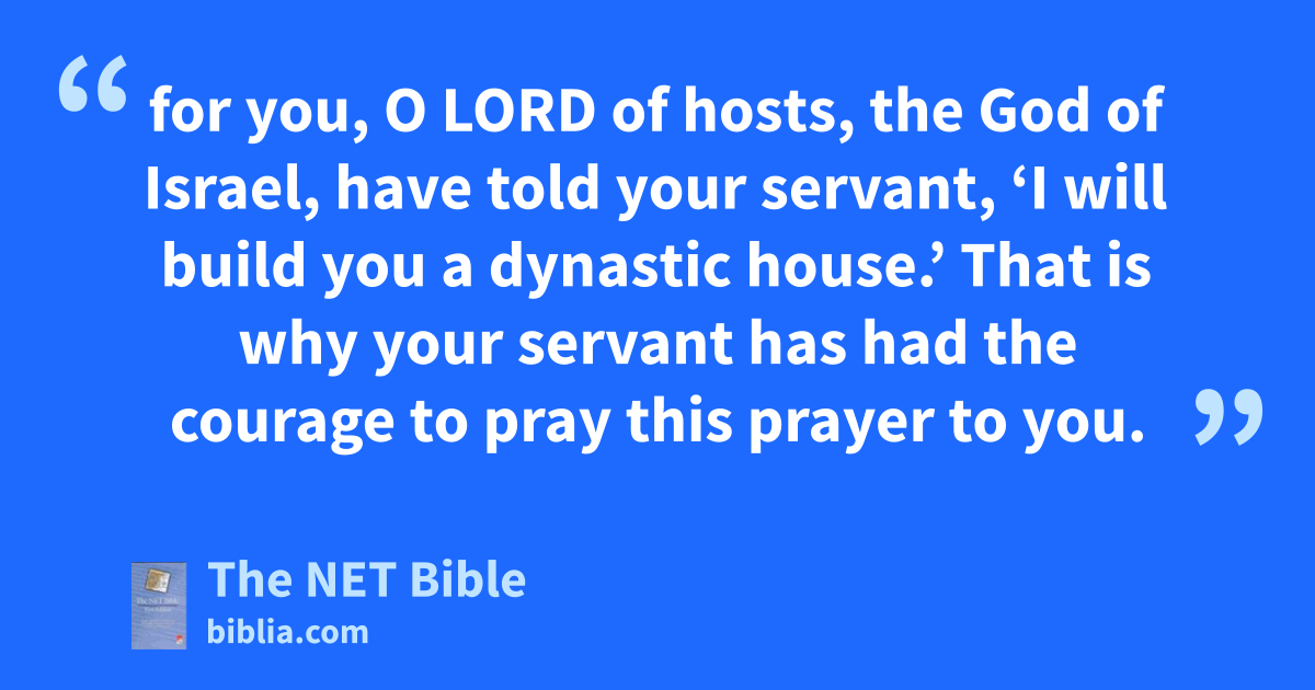 7:18 King David went in, sat before the Lord, and said, “Who am I, O Lord God, and what is my family,27 that you should have brought me to this point? 7:19 And you didn’t stop there, O Lord God! You have also spoken about the future of your servant’s family.28 Is this your usual way of dealing with men,29 O Lord God? 7:20 What more can David say to you? You have given your servant special recognition,30 O Lord God! 7:21 For the sake of your promise and according to your purpose31 you have done this great thing in order to reveal it to your servant.32 7:22 Therefore you are great, O Lord God, for there is none like you! There is no God besides you! What we have heard is true!33 7:23 Who is like your people, Israel, a unique nation34 on the earth? Their God35 went36 to claim37 a nation for himself and to make a name for himself! You did great and awesome acts for your land,38 before your people whom you delivered for yourself from the Egyptian empire and its gods.39 7:24 You made Israel your very own people for all time.40 You, O Lord, became their God. 7:25 So now, O Lord God, make this promise you have made about your servant and his family a permanent reality.41 Do as you promised,42 7:26 so you may gain lasting fame,43 as people say,44 ‘The Lord of hosts is God over Israel!’ The dynasty45 of your servant David will be established before you, 7:27 for you, O Lord of hosts, the God of Israel, have told46 your servant, ‘I will build you a dynastic house.’47 That is why your servant has had the courage48 to pray this prayer to you. 7:28 Now, O sovereign Lord, you are the true God!49 May your words prove to be true!50 You have made this good promise to your servant!51 7:29 Now be willing to bless your servant’s dynasty52 so that it may stand permanently before you, for you, O sovereign Lord, have spoken. By your blessing may your servant’s dynasty be blessed on into the future!”53