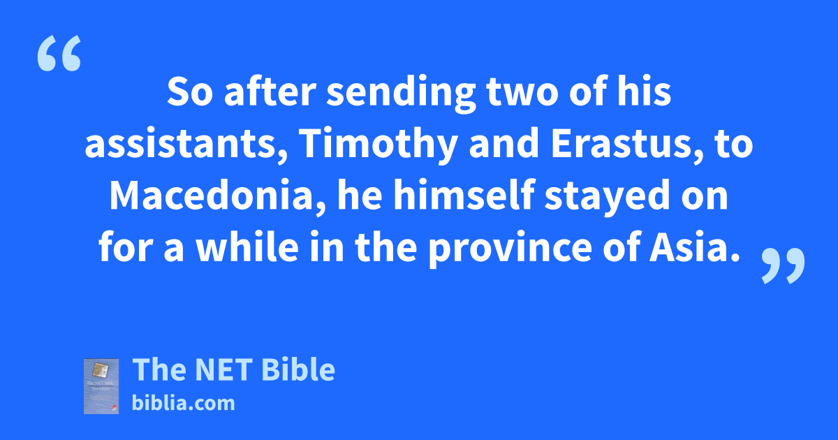 19:21 Now after all these things had taken place,69 Paul resolved70 to go to Jerusalem,71 passing through Macedonia72 and Achaia.73 He said,74 “After I have been there, I must also see Rome.”75 19:22 So after sending76 two of his assistants,77 Timothy and Erastus, to Macedonia,78 he himself stayed on for a while in the province of Asia.79